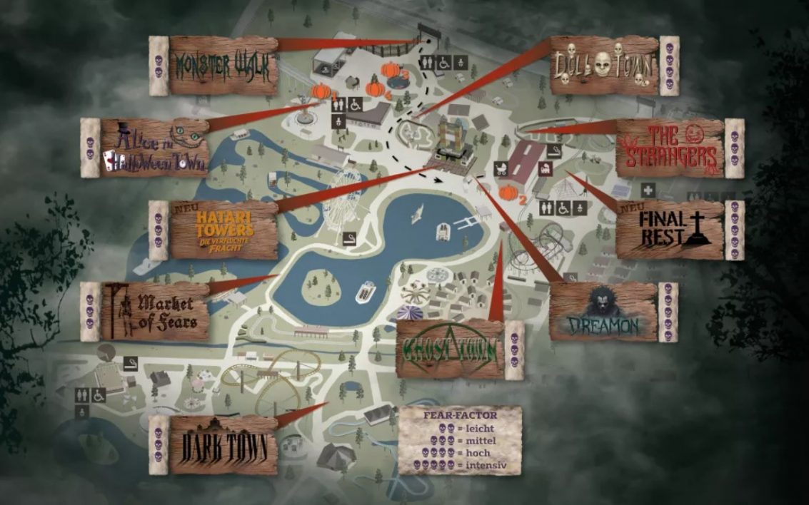 Wichtige Hinweise: Zu den Halloween Nights sind ausgewählte Bereiche und Attraktionen im Freizeitpark, sowie die Horror-Labyrinthe bis 22 Uhr geöffnet. Ab 17 Uhr gilt an den Kassen der ermäßigte Abendeintritt. Selbstverständlich können alle Gäste mit regulären Tageseintrittskarten an den Tagen die ausgewählten Bereiche des Freizeitparks auch bis 22 Uhr nutzen. Kostümierte und geschminkte Gäste sind herzlich willkommen. Vollmasken sind nicht gestattet. Bitte beachte die Sicherheitshinweise an den Eingängen der Attraktionen. Einige Attraktionen haben eine Altersbeschränkung. Insbesondere für kleine Kinder könnten die Halloween Nights zu gruselig sein.