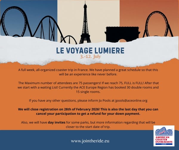 Begleitet die American Coaster Enthusiasts Europe zu phantastischen Achterbahn-Events 2026. ACE Europe ist der europäische Ableger des weltweit größten Achterbahnfanclubs American Coaster Enthusiasts.