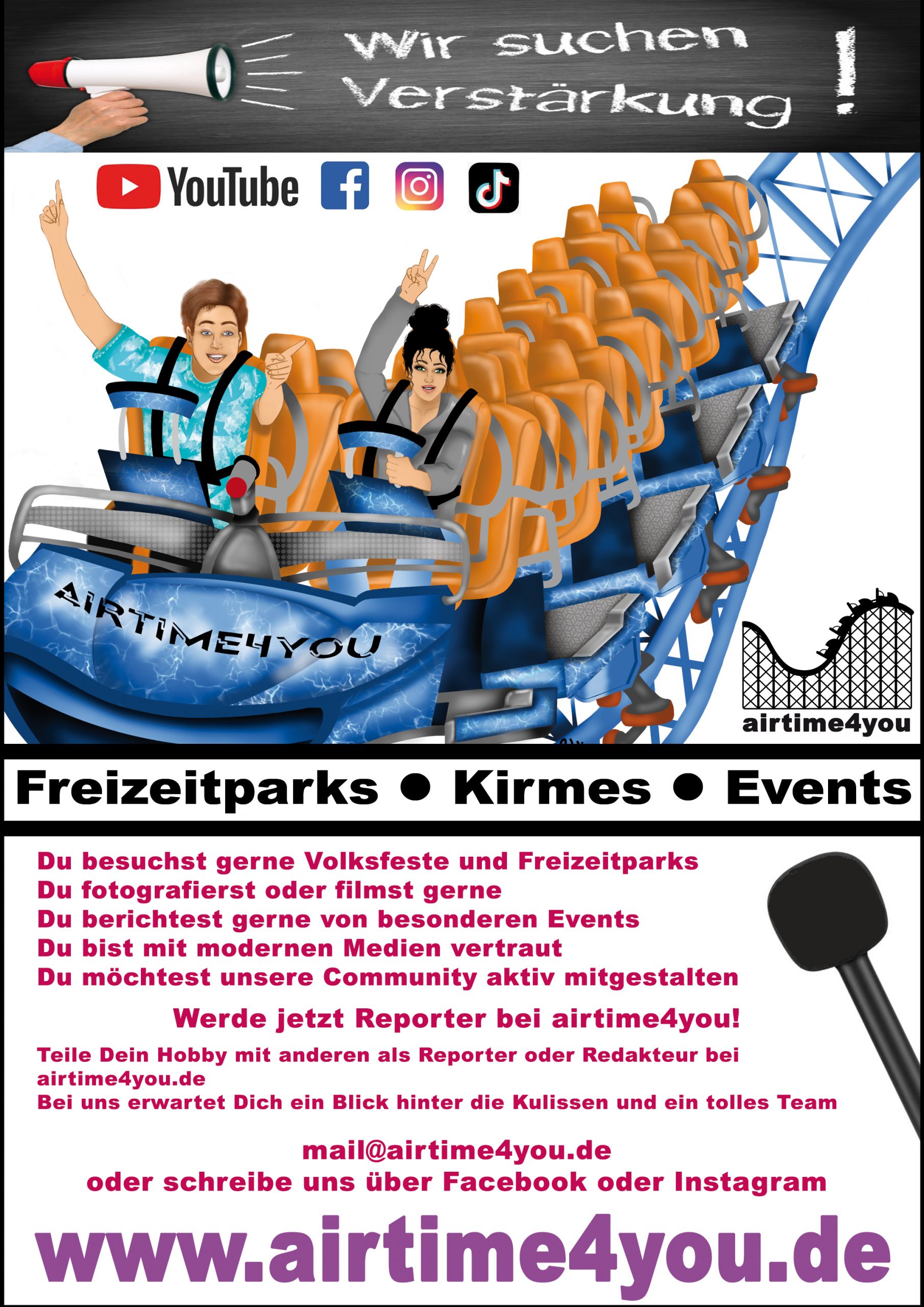 airtime4you ist unsere wachsende Community von Fans von Freizeitparks, Achterbahnen, Kirmes und Events. Wir haben es uns zur Aufgabe gemacht, immer aktuelle News zu Freizeitparks und Kirmesevents usw. bereitzustellen. Bei unseren Reportagen und Videos steht immer die Attraktion im Mittelpunkt. Wir sehen uns nicht als klassische Influencer oder YouTuber und sind auch nicht als Einzelkämpfer unterwegs; als Gemeinschaft können wir mehr erreichen und unsere Liebe und unser Engagement gilt der Community und den Attraktionen und Events in der Freizeitbranche.